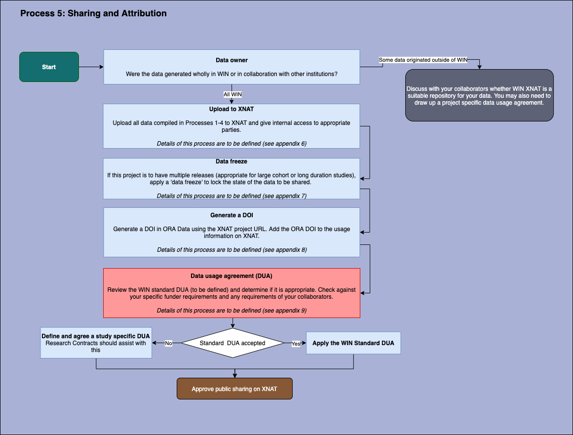 Your shared research data are a valuable output of your work. This process describes adding your data to the XNAT repository and generating a citable digital object identifier (DOI). It also guides you through the selection of an appropriate data usage agreement (DUA) which subsequent users of your data will agree to follow.